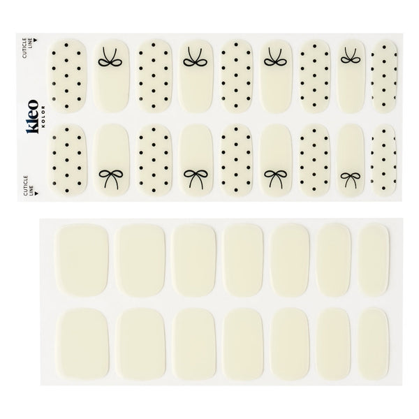 Soft neutrals meet delicate black dots and a subtle bow accent for a look that feels charming without being overly sweet. The placement keeps the design balanced and light.