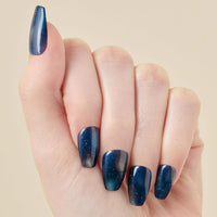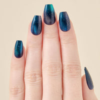 A deep space blend of teal, navy, and violet creates a smooth, shifting glow across every nail. Fine shimmer adds a soft starlit touch that catches light without overwhelming the color. The effect feels magnetic, modern, and effortlessly striking.