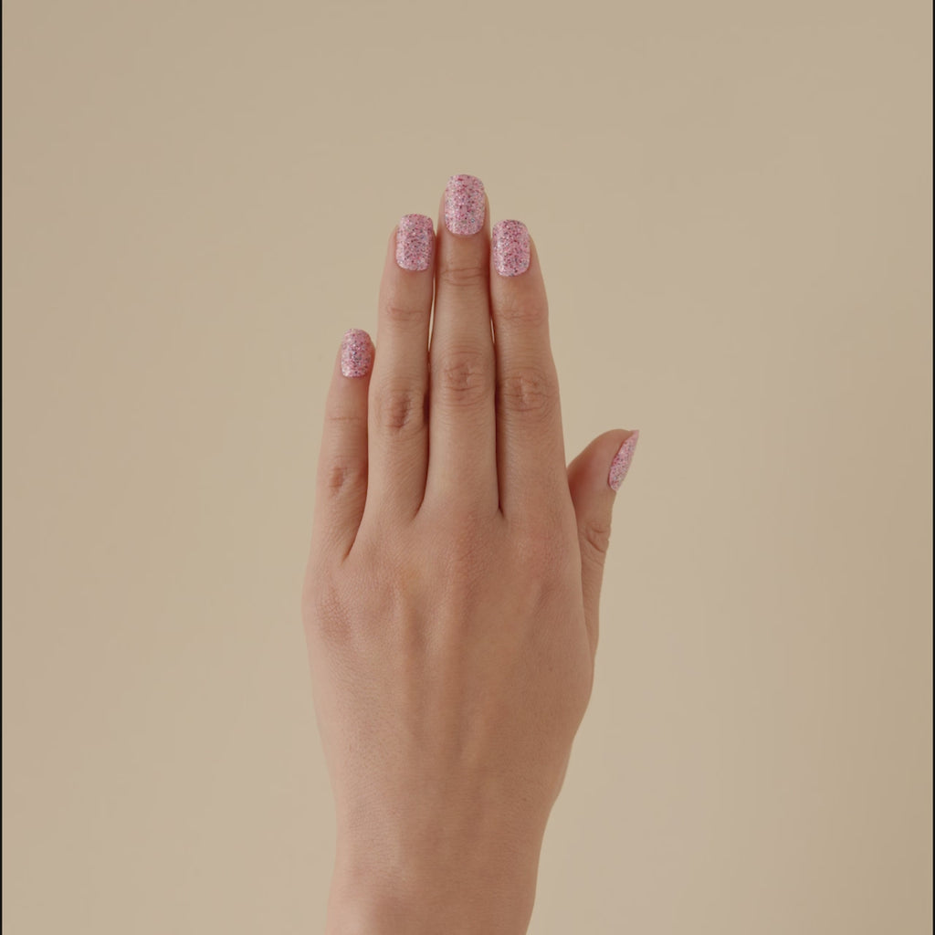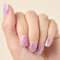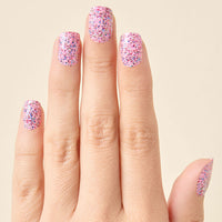 Bubblegum pink gets a playful twist with layers of multicolored glitter. The combination creates a look that’s equal parts sweet and spirited and feels bright, buoyant, and full of fun. It’s an instant mood-lifter with a candy-coated finish.